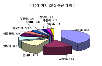 온라인 취업사이트 <사람인>은 지난 7일 삼성전자, 현대자동차, SK텔레콤 등 국내 30대 그룹의 회장, 부회장, 사장 등 CEO 231명의 최종 학력을 분석한 결과를 발표했다. 발표에 따르면 본교 출신 최고경영자 비율은 서울대, 고려대, 연세대에 이어 4위를 차지한 것으로 나타났다. 본교는 전체 최고경영자의 6.9%를 차지해 35.1%를 차지한 서울대와 고려대(14.7%), 연세대(11.7%)의 뒤를 이었다. 본교 다음으로는 성균관대(4.8%), 한국외대(3.9%), 인하대(2.6%) 등이 뒤를 따랐다.이번 조사에서 본교는 6.9%의 출신 점유율을 차지하는데 그쳤지만 이는 최고경영자에 한정된 것으로 일반 임원에까지 조사를 확대할 경우 본교의 점유율은 더욱 높아질 것으로 분석된다. 작년 상반기를 기준으로 5대 그룹 207개 계열사의 이사 이상 임원 3,500 여명을 대상으로 실시된 조사에 따르면 본교는 출신임원의 9%를 차지하고 있으며 이를 10대, 30대 그룹으로 확대된 조사에서는 더욱 많은 임원 점유율을 나타낸 것으로 알려져 있다.