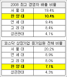 코스닥상장법인협의회는 지난 14일 코스닥 상장사 1029사를 대상으로 한 ‘2008 경영 인명록’을 통해 코스닥 최고 경영자들에 대한 통계 결과를 발표했다. 지난해 9.3%로 코스닥 상장기업 최고경영자 배출 비율 3위에 머물렀던 본교가 올해는 10.4%로 올라 연세대(9.4%)와 고려대(8.4%), 성균관대(4.1%)를 제치고 서울대(19.4%)에 이어 2위를 차지했다. 뿐만 아니라 코스닥 최고경영자를 포함한 등기임원 전체 비율에서도 서울대(20.2%), 연세대(8.9%), 고려대(8.0%), 한양대(7.1%), 성균관대(4.3%) 순으로 상위권에 올랐다.본교 출신 코스닥 상장기업 최고경영자는 탑엔지니어링 대표 이관행(경영 80년 졸) 동문, 인탑스 대표 김재경(경영 74년 졸) 동문 등이 있다. 또한 행남자기 김용주(공업경영 64년 졸) 동문, 양지사 김용세(화학 78년 졸) 동문, 삼우이엠씨 정규수(건축 69년 졸) 동문 등이 최고경영자로서 활발히 활동하고 있다.