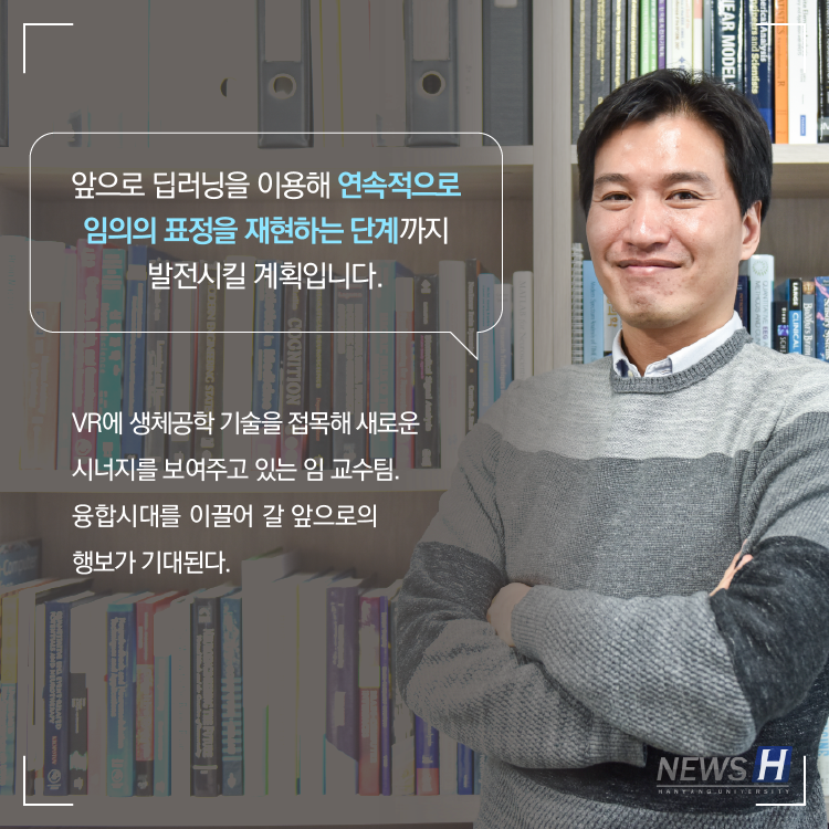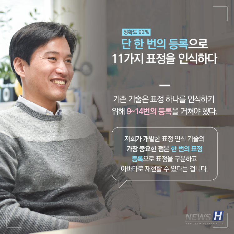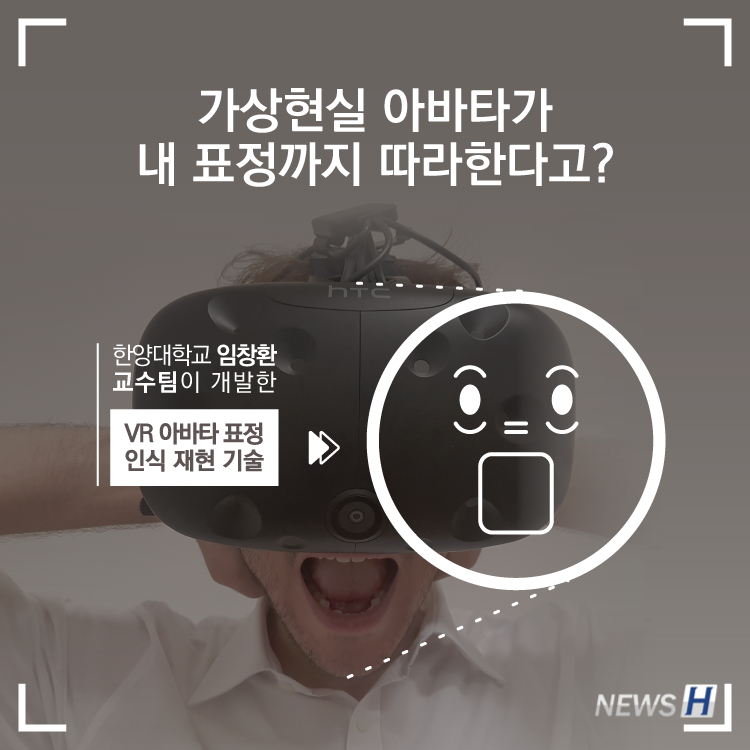 한양대학교 임창환 교수팀이 개발한 VR 아바타 표정 인식 재현 기술 ▲ 카드뉴스의 원본 기사는 아래에서 읽을 수 있습니다- 가상현실 아바타가 내 표정까지 따라한다고? ▲ Click to read the English article- VR Avatars Copy Your Facial Expressions 전채령 dotteil@naver.com 다른기사 보기 저작권자 © 뉴스H 무단전재 및 재배포 금지 당신만 안 본 뉴스 [포토스토리] "AI 시대 해답은 브랜딩", 오세훈 서울시장의 경영학 특강 현장 Into the Creation 2025, 창작자들의 꿈에 날개를 이찬규 학생, 사이버·우주 융합연구로 2025 사이버안보논문공모전 대상 수상 한양대, '2026 QS 지속가능성 순위' 세계 161위, 국내 4위 기록 해커톤에서 인턴십까지, 현대차 사내 스타트업에 다녀오다 [창업지원단 인턴십 경험기] [포토스토리] 한양 속에 사회혁신을 품다, SSIR 먼슬리 콜로키움 현장 행복은 좋은 경험의 ‘빈도’에서, 서은국 교수와 함께한 한양인의 힐링콘서트 현장 [포토스토리] "AI 시대 해답은 브랜딩", 오세훈 서울시장의 경영학 특강 현장 댓글삭제 삭제한 댓글은 다시 복구할 수 없습니다. 그래도 삭제하시겠습니까? 비밀번호 닫기 기사 댓글 0 댓글 접기 로그인 후 이용 가능합니다. 댓글 내용입력 비회원 로그인 이름 비밀번호 댓글 내용입력 댓글쓰기 계정을 선택하시면 로그인·계정인증을 통해 댓글을 남기실 수 있습니다. 회원 로그인 비회원 글쓰기 이름 비밀번호 자동등록방지 로그인 옵션 창닫기 기획기사 [포토스토리] "AI 시대 해답은 브랜딩", 오세훈 서울시장의 경영학 특강 현장 Into the Creation 2025, 창작자들의 꿈에 날개를 해커톤에서 인턴십까지, 현대차 사내 스타트업에 다녀오다 [창업지원단 인턴십 경험기] [포토스토리] 한양 속에 사회혁신을 품다, SSIR 먼슬리 콜로키움 현장 행복은 좋은 경험의 ‘빈도’에서, 서은국 교수와 함께한 한양인의 힐링콘서트 현장 [카드뉴스] '한양대학교 SDGs? 알고 보니 내 일상 속에 있었다!' 1편
