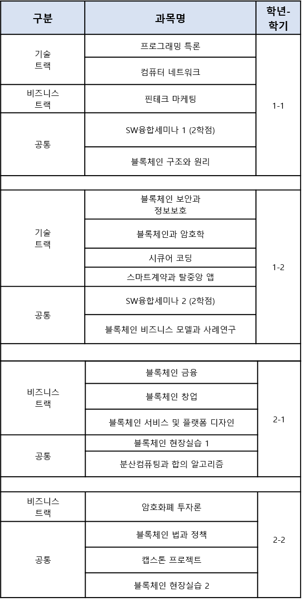 다가오는 24일 합격자 발표를 시작으로 신입생들은 4학기 과정을 거치며 블록체인 관련 다양한 전공을 이수한다. 학부 전공과 상관없이 학위과정을 마칠 수 있도록 설계된 ‘투트랙(Two Track) 커리큘럼’ 중 적성과 진로에 따라 기술 트랙과 비즈니스 트랙 중 선택이 가능하다. 기술 트랙은 프로그래밍, 코딩 등 기술적인 측면을 중점적으로 다루며, 비즈니스 트랙은 핀테크(금융·기술 결합 서비스) 마케팅, 창업 등 블록체인 관련 경영학을 중점으로 과목을 편성했다. 신입생은 자신의 목적에 맞게 트랙을 선택하고 개개인의 수요에 맞는 커리어를 개발할 수 있다.