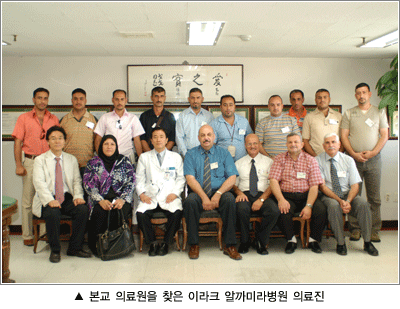 의료원은 지난 8월 9일부터 오는 10월 17일까지 이라크 알까라마병원 의사 5명과 진료 보조인력 10명을 초청해 연수를 실시한다. 연수는 오랜 전쟁으로 낙후된 이라크 의료체계 정비와 의료능력 향상을 위해 마련된 것으로 본교 보건의료연구소에서 주관해 진행한다. 연수팀은 의료원에서 임상교육에 관한 실습과 병원 인력운용에 관한 강의를 받게 된다. 또한 현장실습과 강의를 통해 임상병리기술 관련 교육을 받고 이라크로 돌아갈 예정이다. 특히 이번 연수팀에는 이라크 바그다드의 알까라마병원 원장, 임상과장 등 전문 진료인력과 함께 병원 운영을 담당하는 보조인력들이 포함돼 의료 능력 향상뿐만 아니라, 병원능력 향상을 함께 이룰 것으로 기대하고 있다.소아과, 산부인과, 일반외과, 정형외과, 내과, 마취과 등으로 이뤄진 이라크 전문의들은 각 과별로 나뉘어 앞으로 약 2달 동안 강의와 함께 임상 실습을 받을 예정이다. 또한 연수 전문의들은 의료원의 첨단 장비 및 의료시설을 둘러볼 예정이다. 이와 함께 연수 일정에는 임상병리기술뿐만 아니라 의료 및 산업시설 시찰도 계획되어 있다. 연수팀은 제약회사, 서북시립병원, 서울시 보건국 및 보건소, 건강보험심사평가원, 국립암센터 등 각종 의료기관을 둘러볼 예정이다. 또한 경주문화유적 및 울산, 포항 지역 산업시설을 탐방해 한국의 문화, 경제 발전 정도를 이라크에 전파할 예정이다.