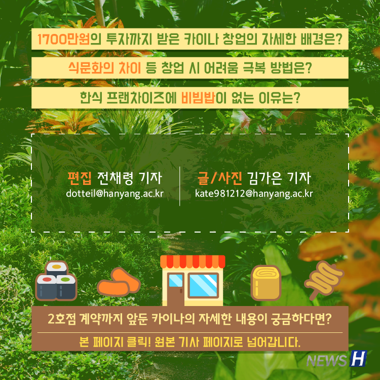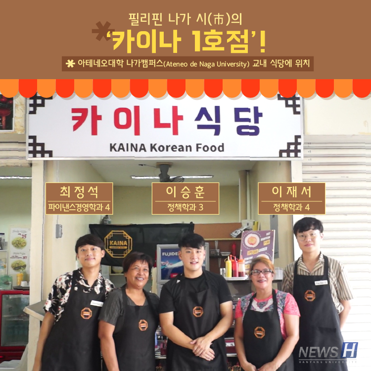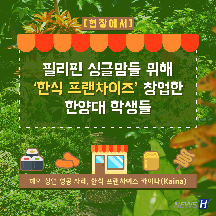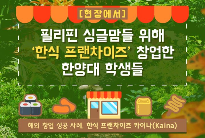 해외 창업 성공 사례, 한식 프랜차이즈 카이나(Kaina) ▲ 카드뉴스의 원본 기사는 아래에서 읽을 수 있습니다- [현장에서] 필리핀 싱글맘들 위해 ‘한식 프랜차이즈’ 창업한 한양대 학생들 전채령 dotteil@naver.com 다른기사 보기 저작권자 © 뉴스H 무단전재 및 재배포 금지 당신만 안 본 뉴스 [포토스토리] "AI 시대 해답은 브랜딩", 오세훈 서울시장의 경영학 특강 현장 Into the Creation 2025, 창작자들의 꿈에 날개를 이찬규 학생, 사이버·우주 융합연구로 2025 사이버안보논문공모전 대상 수상 한양대, '2026 QS 지속가능성 순위' 세계 161위, 국내 4위 기록 해커톤에서 인턴십까지, 현대차 사내 스타트업에 다녀오다 [창업지원단 인턴십 경험기] [포토스토리] 한양 속에 사회혁신을 품다, SSIR 먼슬리 콜로키움 현장 행복은 좋은 경험의 ‘빈도’에서, 서은국 교수와 함께한 한양인의 힐링콘서트 현장 [포토스토리] "AI 시대 해답은 브랜딩", 오세훈 서울시장의 경영학 특강 현장 댓글삭제 삭제한 댓글은 다시 복구할 수 없습니다. 그래도 삭제하시겠습니까? 비밀번호 닫기 기사 댓글 0 댓글 접기 로그인 후 이용 가능합니다. 댓글 내용입력 비회원 로그인 이름 비밀번호 댓글 내용입력 댓글쓰기 계정을 선택하시면 로그인·계정인증을 통해 댓글을 남기실 수 있습니다. 회원 로그인 비회원 글쓰기 이름 비밀번호 자동등록방지 로그인 옵션 창닫기 기획기사 [포토스토리] "AI 시대 해답은 브랜딩", 오세훈 서울시장의 경영학 특강 현장 Into the Creation 2025, 창작자들의 꿈에 날개를 해커톤에서 인턴십까지, 현대차 사내 스타트업에 다녀오다 [창업지원단 인턴십 경험기] [포토스토리] 한양 속에 사회혁신을 품다, SSIR 먼슬리 콜로키움 현장 행복은 좋은 경험의 ‘빈도’에서, 서은국 교수와 함께한 한양인의 힐링콘서트 현장 [카드뉴스] '한양대학교 SDGs? 알고 보니 내 일상 속에 있었다!' 1편