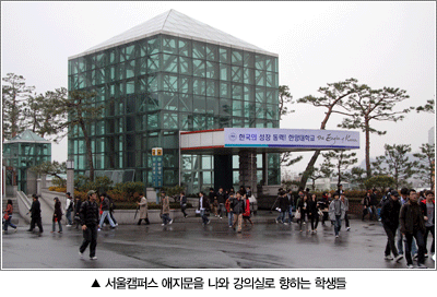 [서울캠퍼스] 매일 아침, 지하철이 도착한 후 애지문(愛智門)에서 뿜어져 나오는 학생들의 모습은 말 그대로 장관이다. 1교시 시작 10분 전, 애지문은 수업 시간에 맞춰 서둘러 강의실로 향하는 학생들로 붐볐다. 종종 걸음으로 하루를 시작하는 학생들의 얼굴에서 활기가 느껴진다. ‘본교의 건학이념으로 통하는 문이며 지혜로운 사랑의 실천자들이 더 큰 세계로 나가는 문’이라는 의미를 지닌 애지문. 그래서 캠퍼스의 아침은 힘이 넘친다. 이 뜨거운 힘이 교정 곳곳에 퍼지며 하루의 시작을 알린다.