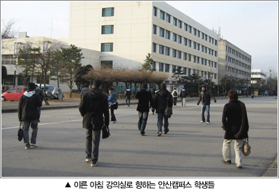 [안산캠퍼스] 안산캠퍼스의 아침은 생기가 넘친다. 몇몇 학생들이 청량한 아침을 즐기며 등교하는 모습이 보였다. 그들은 옷깃을 여미며 서로 다른 목적지를 향해 분주하게 걸어가고 있다. 이내 셔틀버스가 도착하자 제 1 공학관으로 향하는 길이 전보다 많은 학생들로 붐볐다. 학생들이 제각각 수업이 있는 강의실로 발걸음을 옮긴다. 기숙사를 나선 학생들도 줄줄이 교정에 들어섰다. 사방에서 조금씩 모여드는 학생들의 모습으로 안산캠퍼스의 하루가 시작된다. 아침 공기와 함께 학생들의 생기로 각 강의실이 채워진다.휴식(休息). 12 : 30