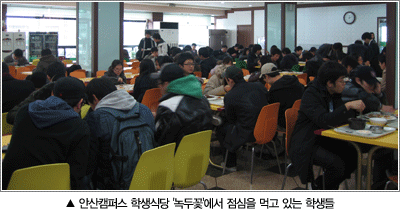 [안산캠퍼스] 오전 수업이 끝나자 학생들이 학생식당으로 하나둘 들어서기 시작했다. 식당은 학생들로 금세 가득 찼다. 곳곳에서 느긋하게 점심 식사를 즐기는 학생들의 모습이 보인다. 대개 친구들과 사소한 이야기를 나누며 식사 시간을 만끽하고 있다. 금강산도 식후경이라고 했던가. 이렇게 많은 학생이 모여 왁자지껄하게 밥을 먹는 모습을 보고 있노라면 젊음의 기운이 절실히 느껴진다.