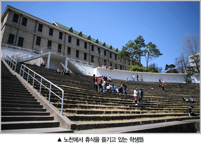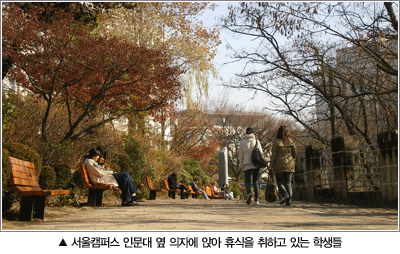 [서울캠퍼스] 캠퍼스 곳곳에서 허기를 채운 학생들이 삼삼오오 모여 이야기를 나누고 있는 모습에선 따뜻함이 느껴진다. 한대방송국에서 들려주는 음악소리와 함께 학생들은 휴식에 흠뻑 빠져 있다. 서울캠퍼스에는 노천극장, 행원파크, 자주광장 등 대학의 낭만을 느낄 수 있는 공간이 많다. 그 중 교정을 내려다보며 쉴 수 있는 인문대 옆 걸상의 고즈넉함은 그만의 특별함이 있다. 가끔은 혼자 책을 읽기도 하고 친구들과 수다를 떨 수 있는 공간들. 교정에서 점심 휴식을 만끽하고 있는 대학생의 모습이 한 폭 그림 같은 이유다.열정(熱情). 19 : 00