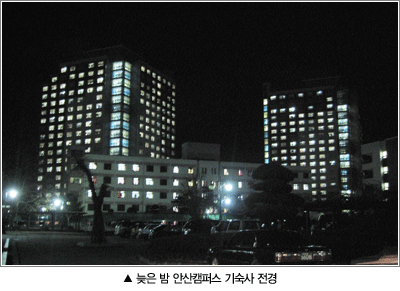 [안산캠퍼스] 꽤 늦은 시간이지만 안산캠퍼스 기숙사 역시 불빛으로 환하다. 기숙사에서 생활하는 학생들이 각자 저마다의 시간을 보내고 있기 때문이다. 학생들은 주로 독서를 즐기거나 친구들과 어울려 운동을 하는 등 개인 시간을 보낸다. 또 여가 활동을 통해 휴식을 취하기도 한다. 뿐만 아니라 각자 조용하게 하루를 정리하고 마감하는 시간을 갖는다. 이 모두가 보다 나은 내일을 위한 충전의 시간이다. 이렇게 한양의 하루가 다시 저물고 있다. 활기찬 내일을 기약하면서.시작, 휴식 그리고 열정과 충전