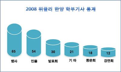 올해 1월 1주부터 12월 2주까지 위클리한양이 취재한 학부기사는 정확히 200개다. 이를 소재별로 나눠 분석해 봤다. 학부기사로 가장 많이 취재한 내용은 행사 관련 기사다. 총 65개 행사가 학부기사에서 다뤄졌다. 각종 학술대회, 학부모 간담회, 개강 행사, 새로 배움터 등 각 단과대가 주최한 각종 행사들을 살펴볼 수 있다. 다음은 인물 동정 관련 내용이다. 인물을 다룬 기사는 총 54개다. 신임교수 인터뷰, 각종 수상전 입상 소식 등 학생과 교수를 비롯한 각 단과대의 인물들을 기사로 만나볼 수 있다. 다음은 발표회 부분이다. 발표회는 학술제를 비롯한 연주회, 졸업 전시회 등의 내용으로, 총 30개의 기사에서 찾아 볼 수 있다. 또 다른 학부기사의 특징은 주변에서 진행하는 각종 동문회 기사를 많이 다루었다는 점이다. 올해 학부기사에서 집계된 동문회 관련 내용은 총 18개로 동문회 정기총회 개최와 같은 내용이 학부기사를 통해 소개됐다. 이밖에도 21개 기사에서 단과대 차원의 협약 체결, 발전위원단 발족과 같은 기타 내용을 살펴볼 수 있다. 마지막으로 강연회 관련 기사는 총 12개로, 단과대에서 개최한 각종 강연회 소식이 주요 내용이었다.학부기사는 각 단과대의 행사와 인물을 중심으로 생산하고 있다. 이는 그만큼 교내에서 각종 행사가 활발히 열리고 있다는 의미로 해석할 수 있다. 또한 각 분야에서 활발히 성과를 내고 있는 한양인이 많다는 뜻이기도 하다. 이밖에도 졸업발표회나 학술제 등 유무형의 성과 관련 기사 내용들도 살펴볼 수 있다. 이 모든 게 한양인의 땀의 결과물이다.
