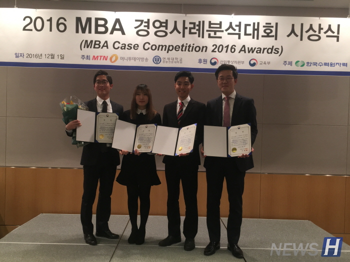 한양대 경영전문대학원 재학생 팀 NEOLUX(엄요한, 노혜영, 허대행, 김진우 씨)가 1일 ‘2016 MBA 경영사례분석대회’에서 산업통상자원부장관상을 받았다. 이 대회는 연세대학교 경영전문대학원과 머니투데이방송이 공동으로 주최하는 대회로, 올해 대회에는 한국수력원자력이 3개의 주제를 제시했다.