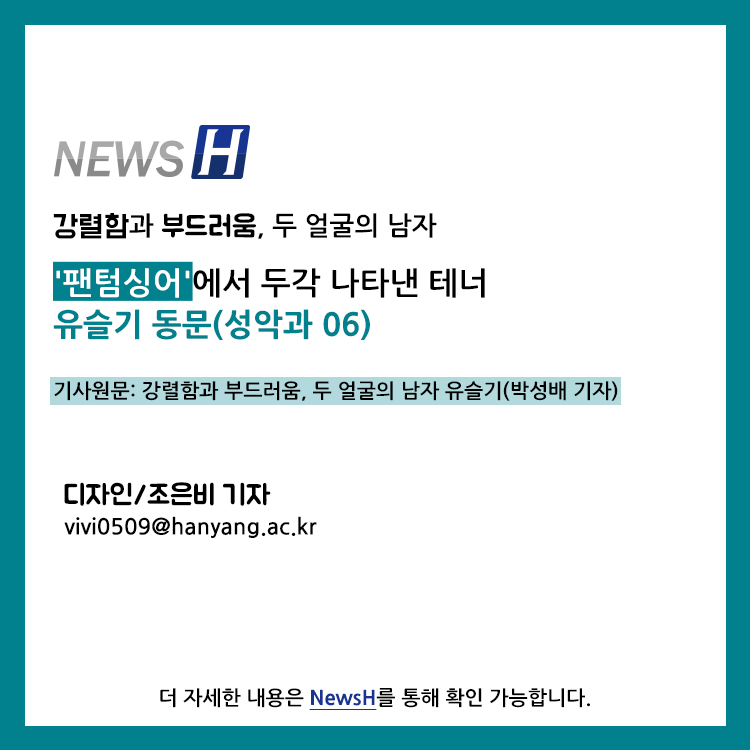 강렬함과 부드러움, 두 얼굴의 남자 ▲ 카드뉴스의 원본 기사는 아래에서 읽을 수 있습니다 - 강렬함과 부드러움, 두 얼굴의 남자 유슬기 동문 조은비 gad2226@naver.com 다른기사 보기 저작권자 © 뉴스H 무단전재 및 재배포 금지 당신만 안 본 뉴스 [포토스토리] "AI 시대 해답은 브랜딩", 오세훈 서울시장의 경영학 특강 현장 Into the Creation 2025, 창작자들의 꿈에 날개를 이찬규 학생, 사이버·우주 융합연구로 2025 사이버안보논문공모전 대상 수상 한양대, '2026 QS 지속가능성 순위' 세계 161위, 국내 4위 기록 해커톤에서 인턴십까지, 현대차 사내 스타트업에 다녀오다 [창업지원단 인턴십 경험기] [포토스토리] 한양 속에 사회혁신을 품다, SSIR 먼슬리 콜로키움 현장 행복은 좋은 경험의 ‘빈도’에서, 서은국 교수와 함께한 한양인의 힐링콘서트 현장 2025 중앙일보 대학평가 서울 3위, ERICA 13위 댓글삭제 삭제한 댓글은 다시 복구할 수 없습니다. 그래도 삭제하시겠습니까? 비밀번호 닫기 기사 댓글 0 댓글 접기 로그인 후 이용 가능합니다. 댓글 내용입력 비회원 로그인 이름 비밀번호 댓글 내용입력 댓글쓰기 계정을 선택하시면 로그인·계정인증을 통해 댓글을 남기실 수 있습니다. 회원 로그인 비회원 글쓰기 이름 비밀번호 자동등록방지 로그인 옵션 창닫기 기획기사 [포토스토리] "AI 시대 해답은 브랜딩", 오세훈 서울시장의 경영학 특강 현장 Into the Creation 2025, 창작자들의 꿈에 날개를 해커톤에서 인턴십까지, 현대차 사내 스타트업에 다녀오다 [창업지원단 인턴십 경험기] [포토스토리] 한양 속에 사회혁신을 품다, SSIR 먼슬리 콜로키움 현장 행복은 좋은 경험의 ‘빈도’에서, 서은국 교수와 함께한 한양인의 힐링콘서트 현장 [카드뉴스] '한양대학교 SDGs? 알고 보니 내 일상 속에 있었다!' 1편