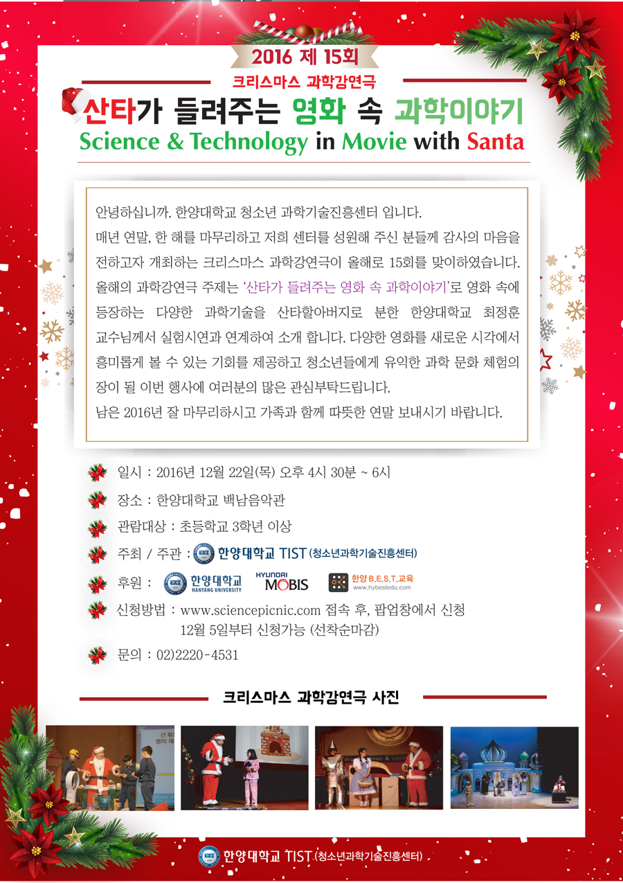 극의 주제는 ‘산타가 들려주는 영화 속 과학 이야기’로, 영화 속에 등장하는 다양한 과학기술을 산타로 분한 최정훈 교수가 실험시연과 연계해 소개한다.