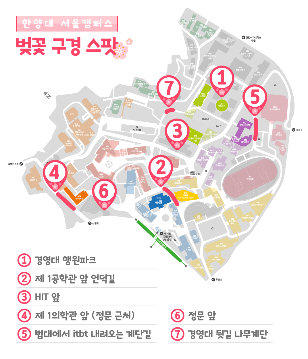 캠퍼스 곳곳에 봄 내음이 가득하다. 한양인들에게 기분 좋은 선물들이 피었다. 꽃이 만발한 교정 안은 자유롭게 꽃을 즐기는 사람들로 가득하다. 잠시 강의실에서 벗어나 사진도 찍고 한양대학교 안 벚꽃 길을 구경하는 것은 어떨까? 꽃이 예쁜 서울캠퍼스 명소들을 꽃지도와 함께 소개한다.