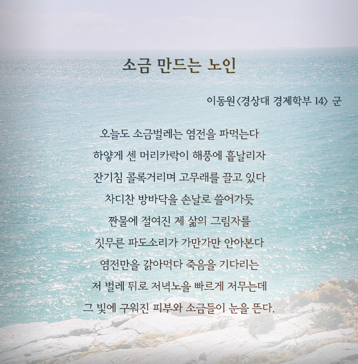 동원: 첫 번째 연의 1행 '오늘도 소금벌레는 염전을 파먹는다'란 부분이요. 소금 만드는 노인을 소금벌레로 묘사했는데, 그 비유가 꽤 괜찮았다고 생각해요(웃음). 연약한 노인이 힘겹게 일하는 모습이 얇은 팔다리로 물 위에 떠있는 소금벌레의 모습과 비슷하다고 생각했거든요.