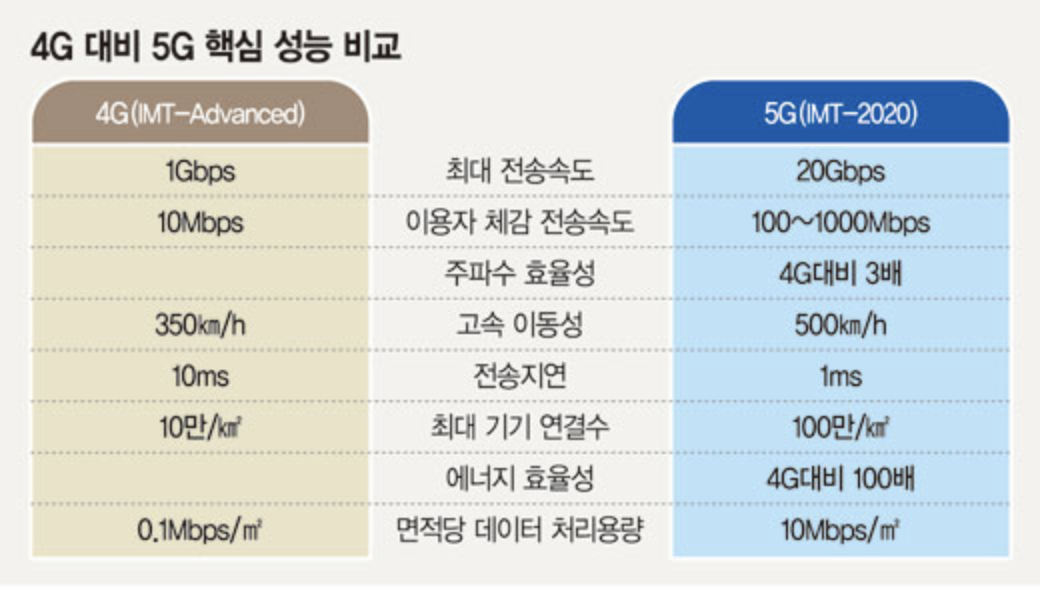 5G는 5세대 이동통신이라는 뜻으로 ‘G’는 세대를 뜻하는 제너레이션(Generation)의 앞 자를 따왔다. 5G는 현재 널리고 쓰이고 있는 4G보다 더 빠른 네트워크로 4G의 전송속도가 1Gbps일 때 5G는 20Gbps에 달한다. 또 대용량 동영상을 초고속 초고해상도로 실시간으로 보낼 수 있을 뿐만 아니라 여러 기기가 실시간으로 빠르게 연결될 수 있다는 장점을 가지고 있다.