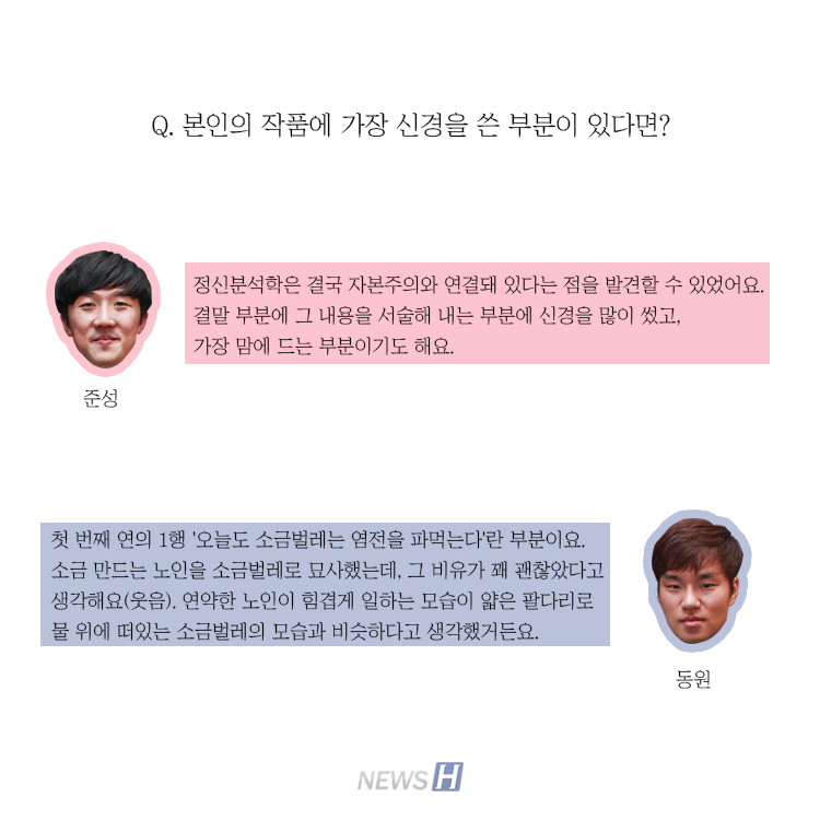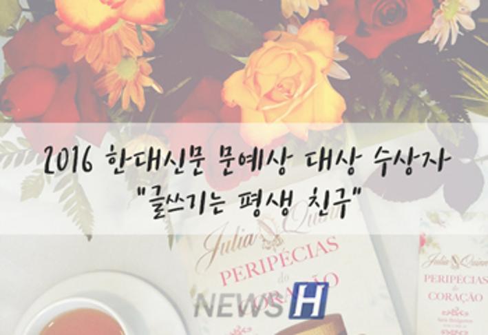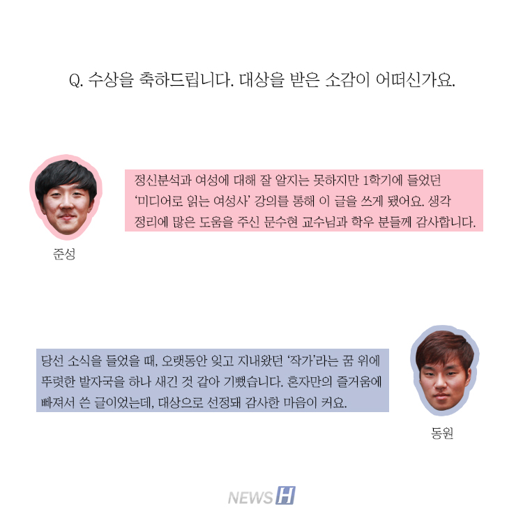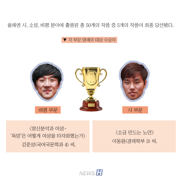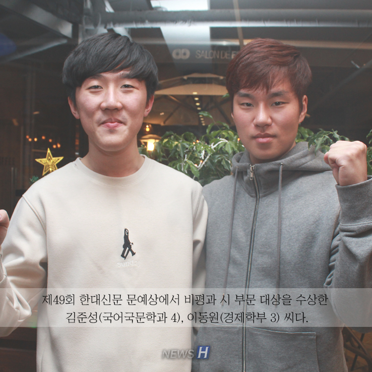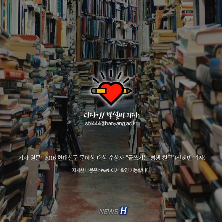 제49회 한대신문 문예상 대상자 김준성(국어국문학과 4), 이동원(경제학부 3) 씨 카드뉴스의 원본 기사는 아래에서 읽으실 수 있습니다▲ 2016 한대신문 문예상 대상 수상자 “글쓰기는 평생 친구” 관련기사 한대신문, 제58회 문예상 출품 안내 박설비 sbi444@hanyang.ac.kr 다른기사 보기 저작권자 © 뉴스H 무단전재 및 재배포 금지 당신만 안 본 뉴스 [포토스토리] "AI 시대 해답은 브랜딩", 오세훈 서울시장의 경영학 특강 현장 Into the Creation 2025, 창작자들의 꿈에 날개를 이찬규 학생, 사이버·우주 융합연구로 2025 사이버안보논문공모전 대상 수상 한양대, '2026 QS 지속가능성 순위' 세계 161위, 국내 4위 기록 해커톤에서 인턴십까지, 현대차 사내 스타트업에 다녀오다 [창업지원단 인턴십 경험기] [포토스토리] 한양 속에 사회혁신을 품다, SSIR 먼슬리 콜로키움 현장 행복은 좋은 경험의 ‘빈도’에서, 서은국 교수와 함께한 한양인의 힐링콘서트 현장 2025 중앙일보 대학평가 서울 3위, ERICA 13위 댓글삭제 삭제한 댓글은 다시 복구할 수 없습니다. 그래도 삭제하시겠습니까? 비밀번호 닫기 기사 댓글 0 댓글 접기 로그인 후 이용 가능합니다. 댓글 내용입력 비회원 로그인 이름 비밀번호 댓글 내용입력 댓글쓰기 계정을 선택하시면 로그인·계정인증을 통해 댓글을 남기실 수 있습니다. 회원 로그인 비회원 글쓰기 이름 비밀번호 자동등록방지 로그인 옵션 창닫기 기획기사 [포토스토리] "AI 시대 해답은 브랜딩", 오세훈 서울시장의 경영학 특강 현장 Into the Creation 2025, 창작자들의 꿈에 날개를 해커톤에서 인턴십까지, 현대차 사내 스타트업에 다녀오다 [창업지원단 인턴십 경험기] [포토스토리] 한양 속에 사회혁신을 품다, SSIR 먼슬리 콜로키움 현장 행복은 좋은 경험의 ‘빈도’에서, 서은국 교수와 함께한 한양인의 힐링콘서트 현장 [카드뉴스] '한양대학교 SDGs? 알고 보니 내 일상 속에 있었다!' 1편