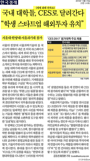 12월 31일 <한국경제>는 한양대가 미국 라스베이거스에서 열리는 세계 최대 전자쇼 'CES 2017'에 참가한다는 내용을 전했습니다. 두 번째로 CES에 참가하는 한양대는 고성능 남성용 마스크팩, 정수필터를 장착한 휴대용 텀블러 등 6가지 제품을 선보일 계획인데요. 한양대는 학부생뿐만 아니라 교내에서 창업교육을 받은 동문 기업가, 기술지주회사의 자회사 제품도 함께 전시합니다. 휴대용 정수기 벤처기업 ‘티크로스’의 김정용 대표는 “한양대 경영대학원을 다니면서 ‘스타트업 아카데미’ 창업강좌를 들은 게 인연이 돼 CES에 참가하게 됐다”며 “빗물·강물까지 정수하는 고성능 텀블러를 처음 공개할 예정”이라고 말했습니다.