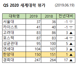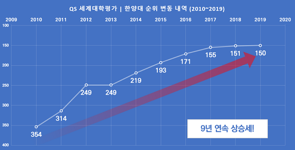 한양대는 세계 150위로 국내에서는 7위에 해당하는 순위다. 전년보다 1계단 상승했으며, 2010년 발표에서 다소 하락했다가 2011년 발표에서 상승하기 시작해, 올해 2019년 발표까지 9년간 하락없이 꾸준한 상승세를 이어가고 있다. 특히 한양대는 학문 평판 분야에서 점수가 오르면서 전체 순위에도 영향을 끼친 것으로 분석된다. 세부 평가지표별로 보면, 졸업생 평판도가 68.4점으로 지표 중 가장 높은 순위를 기록했으며, 동료 연구자의 평가가 지난해 43.5점에서 46.8점으로 상승하면서 해당 지표 순위도 상승했다.