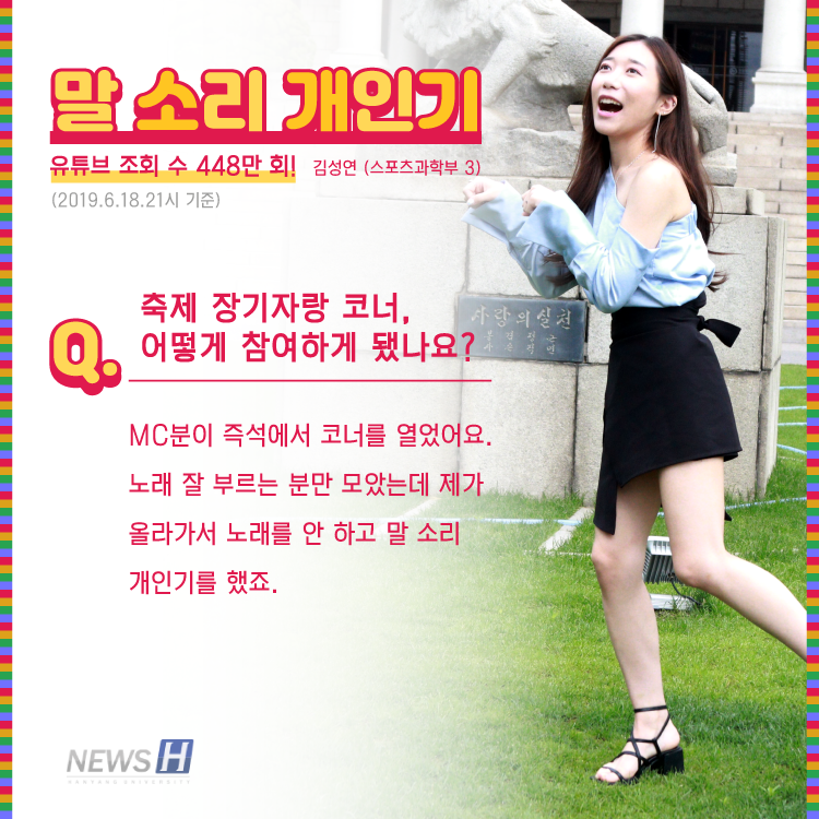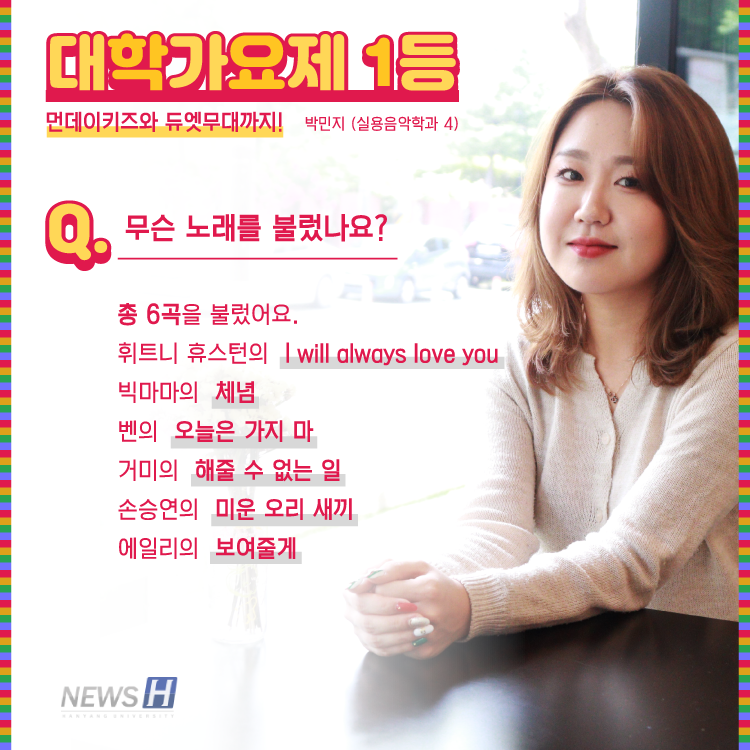 ERICA 축제서 유명세 박민지(실용음악학과 4) 씨, 김성연(스포츠과학부 3) 씨 ▲ 카드뉴스의 원본 기사는 아래에서 읽을 수 있습니다- 축제로 '핫' 해진 그들이 돌아왔다▲ Click to read the English article-ERICA's Got Talent 전채령 dotteil@naver.com 다른기사 보기 저작권자 © 뉴스H 무단전재 및 재배포 금지 당신만 안 본 뉴스 [포토스토리] "AI 시대 해답은 브랜딩", 오세훈 서울시장의 경영학 특강 현장 Into the Creation 2025, 창작자들의 꿈에 날개를 이찬규 학생, 사이버·우주 융합연구로 2025 사이버안보논문공모전 대상 수상 한양대, '2026 QS 지속가능성 순위' 세계 161위, 국내 4위 기록 해커톤에서 인턴십까지, 현대차 사내 스타트업에 다녀오다 [창업지원단 인턴십 경험기] [포토스토리] 한양 속에 사회혁신을 품다, SSIR 먼슬리 콜로키움 현장 행복은 좋은 경험의 ‘빈도’에서, 서은국 교수와 함께한 한양인의 힐링콘서트 현장 2025 중앙일보 대학평가 서울 3위, ERICA 13위 댓글삭제 삭제한 댓글은 다시 복구할 수 없습니다. 그래도 삭제하시겠습니까? 비밀번호 닫기 기사 댓글 0 댓글 접기 로그인 후 이용 가능합니다. 댓글 내용입력 비회원 로그인 이름 비밀번호 댓글 내용입력 댓글쓰기 계정을 선택하시면 로그인·계정인증을 통해 댓글을 남기실 수 있습니다. 회원 로그인 비회원 글쓰기 이름 비밀번호 자동등록방지 로그인 옵션 창닫기 기획기사 [포토스토리] "AI 시대 해답은 브랜딩", 오세훈 서울시장의 경영학 특강 현장 Into the Creation 2025, 창작자들의 꿈에 날개를 해커톤에서 인턴십까지, 현대차 사내 스타트업에 다녀오다 [창업지원단 인턴십 경험기] [포토스토리] 한양 속에 사회혁신을 품다, SSIR 먼슬리 콜로키움 현장 행복은 좋은 경험의 ‘빈도’에서, 서은국 교수와 함께한 한양인의 힐링콘서트 현장 [카드뉴스] '한양대학교 SDGs? 알고 보니 내 일상 속에 있었다!' 1편