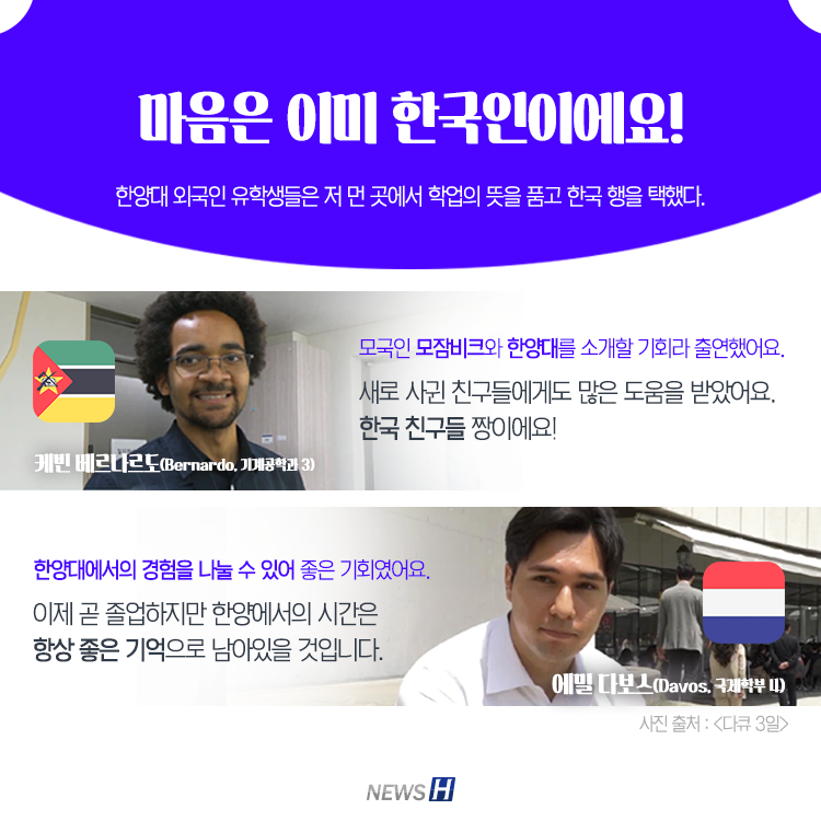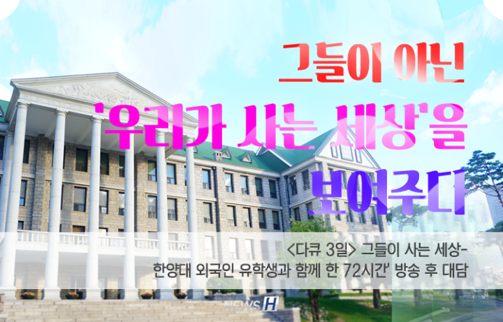 ‘<다큐 3일> 그들이 사는 세상- 한양대 외국인 유학생과 함께 한 72시간’ 방송 후 대담 ▲ 카드뉴스의 한글 기사는 아래에서 읽을 수 있습니다그들이 아닌 '우리가 사는 세상'을 보여주다▲ Click to read the English articleHanyang University X Documentary 3 Days 김지민 spotlight_5@naver.com 다른기사 보기 저작권자 © 뉴스H 무단전재 및 재배포 금지 당신만 안 본 뉴스 [포토스토리] "AI 시대 해답은 브랜딩", 오세훈 서울시장의 경영학 특강 현장 Into the Creation 2025, 창작자들의 꿈에 날개를 이찬규 학생, 사이버·우주 융합연구로 2025 사이버안보논문공모전 대상 수상 한양대, '2026 QS 지속가능성 순위' 세계 161위, 국내 4위 기록 해커톤에서 인턴십까지, 현대차 사내 스타트업에 다녀오다 [창업지원단 인턴십 경험기] [포토스토리] 한양 속에 사회혁신을 품다, SSIR 먼슬리 콜로키움 현장 행복은 좋은 경험의 ‘빈도’에서, 서은국 교수와 함께한 한양인의 힐링콘서트 현장 [포토스토리] "AI 시대 해답은 브랜딩", 오세훈 서울시장의 경영학 특강 현장 댓글삭제 삭제한 댓글은 다시 복구할 수 없습니다. 그래도 삭제하시겠습니까? 비밀번호 닫기 기사 댓글 0 댓글 접기 로그인 후 이용 가능합니다. 댓글 내용입력 비회원 로그인 이름 비밀번호 댓글 내용입력 댓글쓰기 계정을 선택하시면 로그인·계정인증을 통해 댓글을 남기실 수 있습니다. 회원 로그인 비회원 글쓰기 이름 비밀번호 자동등록방지 로그인 옵션 창닫기 기획기사 [포토스토리] "AI 시대 해답은 브랜딩", 오세훈 서울시장의 경영학 특강 현장 Into the Creation 2025, 창작자들의 꿈에 날개를 해커톤에서 인턴십까지, 현대차 사내 스타트업에 다녀오다 [창업지원단 인턴십 경험기] [포토스토리] 한양 속에 사회혁신을 품다, SSIR 먼슬리 콜로키움 현장 행복은 좋은 경험의 ‘빈도’에서, 서은국 교수와 함께한 한양인의 힐링콘서트 현장 [카드뉴스] '한양대학교 SDGs? 알고 보니 내 일상 속에 있었다!' 1편