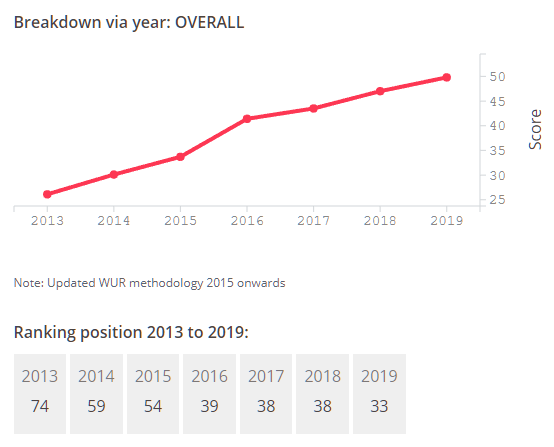 한양대는 논문피인용도 44.1점, 산학협력 수익 86.1점, 국제평판 59.8점, 연구 실적 48점, 교육여건 45.1점을 받아 종합점수 49.8점을 기록해 아시아 33위, 국내 9위로 평가됐다. 전년도 아시아 대학 순위(38위) 대비 5계단 상승했다.