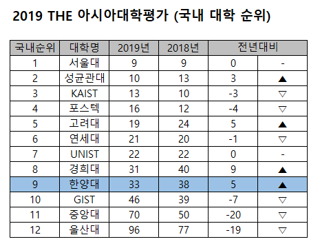 ▶ 2019 THE 아시아대학평가 결과 자세히 보기(THE 홈페이지)