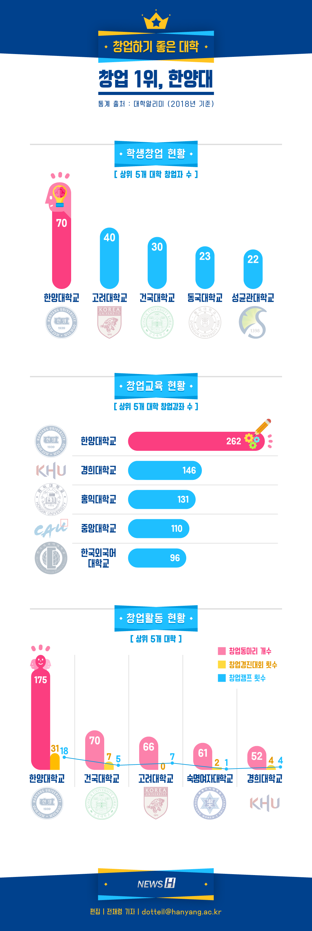 한양대가 ‘2018 한국경제 대학 취업·창업 역량 평가’ 1위에 이어 올해 2019년에도 창업 강자의 자리를 지켰다. 경기 불황에도 뜨거운 창업 수요에 발맞춰 대학에서는 예비 창업자들에게 지원을 아끼지 않고 있다. 이에 대학알리미는 6월 '학생의 창업 및 창업지원 현황', '창업 교육 지원 현황' 등을 공시했다. (관련 기사 보기 -[2020대입잣대] ‘창업1위’ 한양대..고대 건대 동대 성대 톱5 ) 상위 16개 대학 중 한양대는 학생 창업기업 55개(창업자 수 70명), 창업 강좌 수 262개(이론형 강좌 236개, 실습형 강좌 26개), 창업 동아리 175개(참여자 773명) 등으로 압도적 1위를 차지했다.