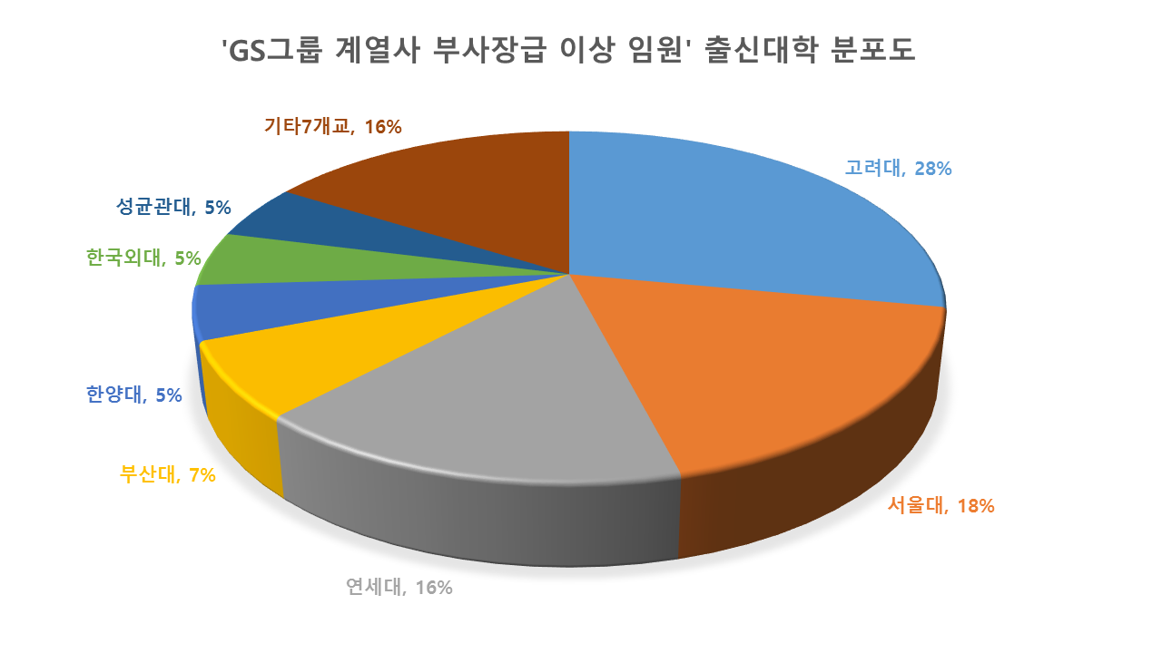 GS그룹 계열사 고위 임원 43명 중 가장 많은 임원을 배출한 대학은 고려대(12명)로 전체 28%를 차지했다. 이어 서울대 18%(8명), 연세대(7명), 부산대(3명), 한양대·한국외대·성균관대 각 5%(각 2명) 등으로 나타났다. 이외에 청주대·조지타운대·전남대·원광대·서강대·경북대·건국대 등이 각 2%(각 1명)로 조사됐다.