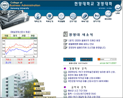 또한 학부소개코너에서 눈여겨볼 곳은 '사이버 강의'인데 온·오프라인수업을 하고 있는 수업과 담당교수의 홈페이지를 링크시켜놓았다. 이중 이영준 교수가 맡은 경영정보시스템 사이버강의실은 뛰어난 기술력이 보이는 것은 아니지만 따뜻하고 정감있게 홈페이지를 꾸며놓았다. 기본적으로 강의 자료와 과제 그리고 성적공고가 홈페이지를 통해 이루어지는데 질의 응답코너는 각 질문마다 이 교수의 답변이 상세하게 달려있어 그 꼼꼼함이 돋보인다. 공적인 업무가 아닌 방명록에도 하나 하나의 글에 답변을 잊지 않는 이 교수의 정성에 조정근(3)군은 "열성적이고 자상하게 그리고 쉽게 가르치는 모습에 이 교수님의 매니아가 되었다."라고 말한다.