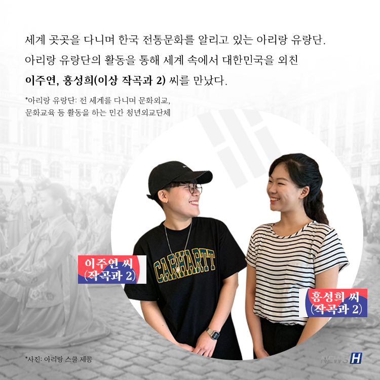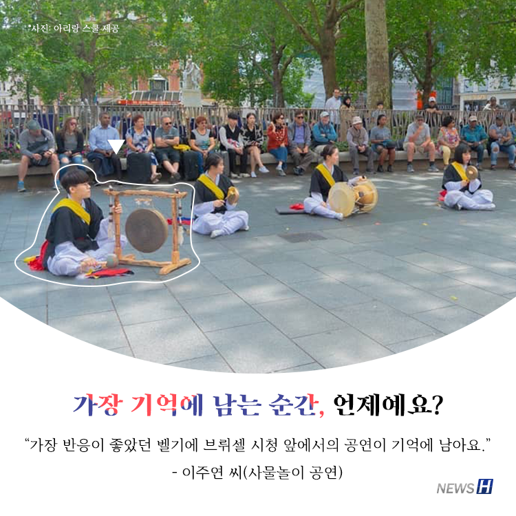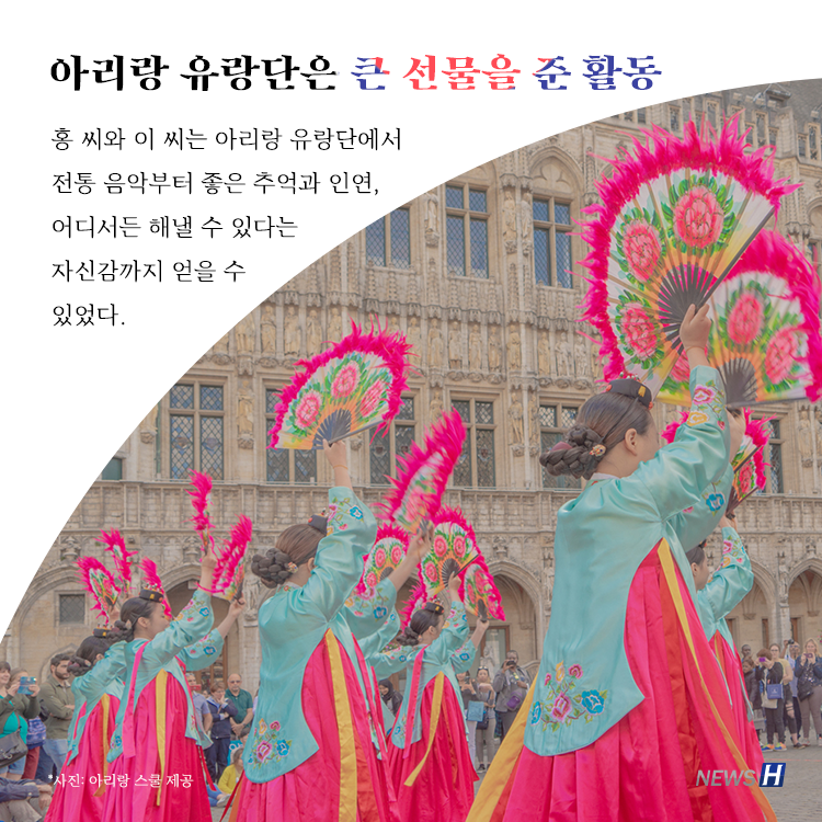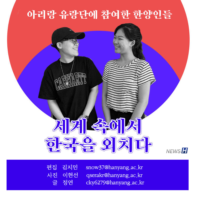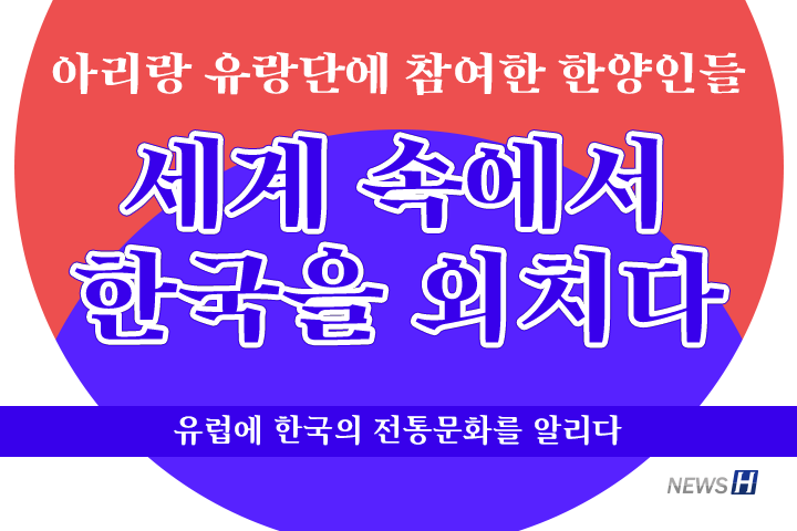유럽에 한국의 전통문화를 알리다 ▲ 카드뉴스의 한글 기사는 아래에서 읽을 수 있습니다아리랑 유랑단에 참여한 한양인들, 세계 속에서 한국을 외치다 김지민 spotlight_5@naver.com 다른기사 보기 저작권자 © 뉴스H 무단전재 및 재배포 금지 당신만 안 본 뉴스 [포토스토리] "AI 시대 해답은 브랜딩", 오세훈 서울시장의 경영학 특강 현장 Into the Creation 2025, 창작자들의 꿈에 날개를 이찬규 학생, 사이버·우주 융합연구로 2025 사이버안보논문공모전 대상 수상 한양대, '2026 QS 지속가능성 순위' 세계 161위, 국내 4위 기록 해커톤에서 인턴십까지, 현대차 사내 스타트업에 다녀오다 [창업지원단 인턴십 경험기] [포토스토리] 한양 속에 사회혁신을 품다, SSIR 먼슬리 콜로키움 현장 행복은 좋은 경험의 ‘빈도’에서, 서은국 교수와 함께한 한양인의 힐링콘서트 현장 2025 중앙일보 대학평가 서울 3위, ERICA 13위 댓글삭제 삭제한 댓글은 다시 복구할 수 없습니다. 그래도 삭제하시겠습니까? 비밀번호 닫기 기사 댓글 0 댓글 접기 로그인 후 이용 가능합니다. 댓글 내용입력 비회원 로그인 이름 비밀번호 댓글 내용입력 댓글쓰기 계정을 선택하시면 로그인·계정인증을 통해 댓글을 남기실 수 있습니다. 회원 로그인 비회원 글쓰기 이름 비밀번호 자동등록방지 로그인 옵션 창닫기 기획기사 [포토스토리] "AI 시대 해답은 브랜딩", 오세훈 서울시장의 경영학 특강 현장 Into the Creation 2025, 창작자들의 꿈에 날개를 해커톤에서 인턴십까지, 현대차 사내 스타트업에 다녀오다 [창업지원단 인턴십 경험기] [포토스토리] 한양 속에 사회혁신을 품다, SSIR 먼슬리 콜로키움 현장 행복은 좋은 경험의 ‘빈도’에서, 서은국 교수와 함께한 한양인의 힐링콘서트 현장 [카드뉴스] '한양대학교 SDGs? 알고 보니 내 일상 속에 있었다!' 1편