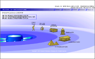 무엇보다 건축홈에서 눈에 띄는 부분은 디자인이다. 처음 소개화면은 건축구조물의 설계도면에서 실제 모습으로 변화하는 플래시로 처리해 누가 보아도 건축학부의 홈페이지임을 알 수 있게 했다. 그리고 첫 화면에서 바로 서울캠퍼스 건축학과 홈페이지를 연결시켜놓아 양 캠퍼스 학생의 편의를 고려했다.