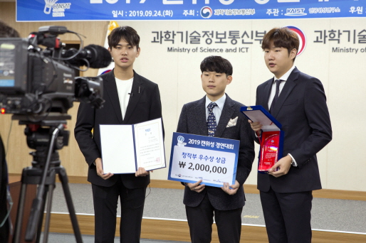 이번 대회에서 한양대학교 융합전자공학부 이태양, 송정수(1학년, 지도교수 김회율 교수) 학생과 서울대학교 전기정보공학부 손세환(1학년) 학생으로 구성된 'Flanker' 팀은 약 6개월의 노력 끝에 ‘효율적 임무지역 도달을 위한 위성형 드론 제작’이라는 연구주제로 수상(KAIST 총장상)을 수상하는 쾌거를 이루었다. Flanker 팀의 주요 임무는 서보모터를 통한 위성체 분리와 모터제어를 통한 정찰 임무로‘위성형 드론’을 제작하는 것이었다. 이에 팀원들은 “국방 기술 세미나를 진행하며 항공우주공학과 인공위성에 대한 전문적인 원리에 대해 심층적으로 공부할 수 있었다"며, "우리의 연구가 미래 우주항공 및 국방기술에 활용되었으면 좋겠다.”고 말했다. 이들은 이후 10월 중순 총 8일간 러시아의 우주산업단지에 방문하여 여러 국가 간의 위성 산업 관계를 도모하는 프로젝트에 참여하고, 11월 제주도에서 열리는 2019 추계학술발표대회에서 연구 결과를 발표할 계획이다.