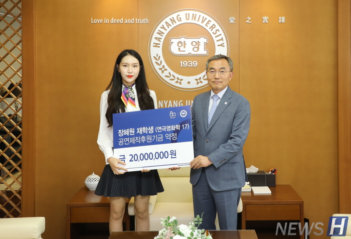 한양대학교 연극영화학과 연극전공 학생들이 9월 16일(월) 서울캠퍼스 신본관 총장실에서 열린 발전기금 전달식에서 연극전공 공연제작 후원을 위한 기금으로 2750만 원을 전달했다.