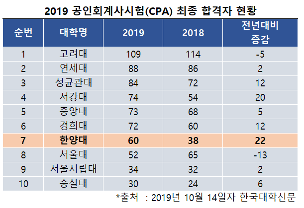 한편 2018년까지는 금융감독원에서 공인회계사시험 합격자 출신대학 현황을 공개하였으나 올해에는 합격자 수만 발표한 관계로, 2019년 대학별 합격자 현황은 한국대학신문에서 자체 조사한 결과를 인용하였다.