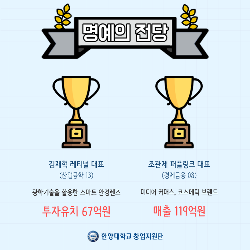 A. 예. 4년 연속 학생창업자 배출 전국대학 1위인 한양대학교에서는 현재 활동중인 창업동아리 학생이 600명, 현재 진행 중인 창업 아이템이 158개, 연간 학생창업 지원규모가 46억에 이릅니다. 창업 '명예의 전당'에 오른 사례를 보면. 김재혁 레티널 대표(산업공학 13)가 광학기술을 활용한 스마트 안경렌즈로 67억원을 투자유치했으며, 조고나제 퍼플링크 대표(경제금융 08)가 미디어 커머스 및 코스메틱 브랜드로 119억원의 매출을 올리기도 했습니다.