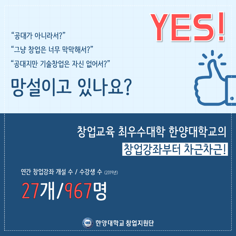 A. 예. 공대가 아니라서, 그냥 창업은 너무 막막해서, 공대지만 기술창업은 자신 없어서 망설이고 있다면 '창업교육 최우수대학'인 한양대학교의 창업강좌부터 차근차근 수강하는 것을 추천합니다. 2019년에만 967명의 수강생이 27개(연간 창업강좌 개설 수)의 창업강좌를 듣고 있습니다.