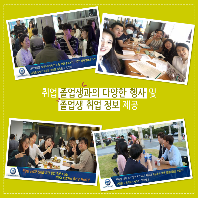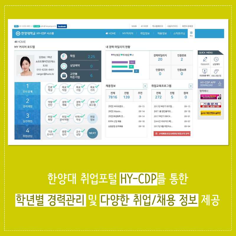 한양대 취업포털 HY-CDP를 통한 학년별 경력을 관리하고 및 다양한 취업 채용 정보를 제공하고 있습니다. 취업에 성공한 졸업생과의 다양한 행사를 개최하고 졸업생의 취업 정보를 다시 재학생들에게 제공하고 있습니다.
