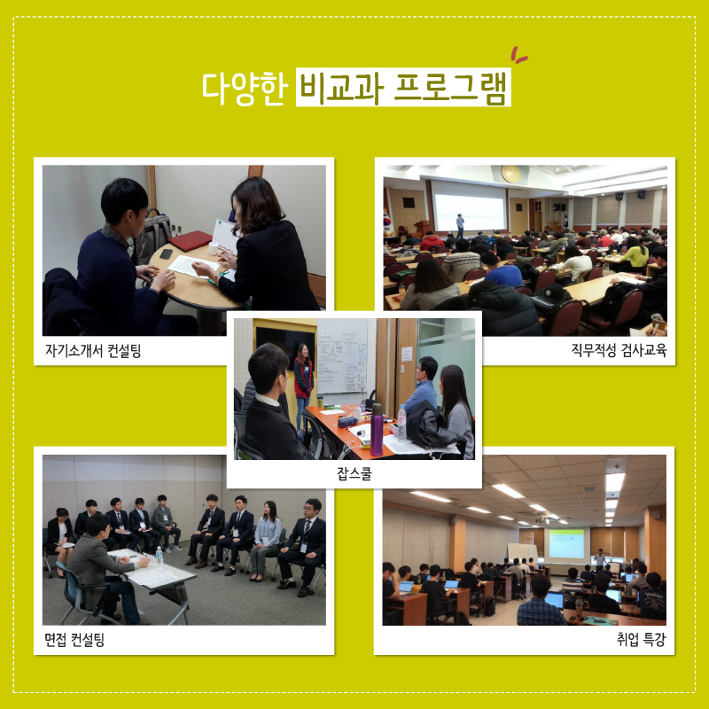 커리어개발센터는 취업에 실질적인 도움이 되는 다양한 취업교과목을 운영하고 있습니다. 학생들은 학년 학기에 따라 교약 필수나 선택으로 지정된 수업들을 수강할 수 있습니다. 자기소개서 컨설팅, 직무적성 검사교육, 잡스쿨, 면접 컨설팅, 취업 특강 등의 비교과 프로그램도 준비되어 있습니다.