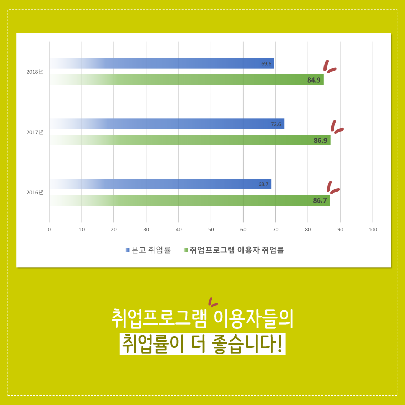 취업프로그램이 실제로 학생들에게 도움이 되고 있다는 것을 통계상으로도 확인할 수 있습니다. 최근 3년간의 통계를 보면 취업프로그램을 이용한 학생들은 우리 대학의 전체 취업률과 비교해도 월등하게 앞서고 있습니다. 즉 취업프로그램을 이용한 경우 취업률이 더 좋다는 것.