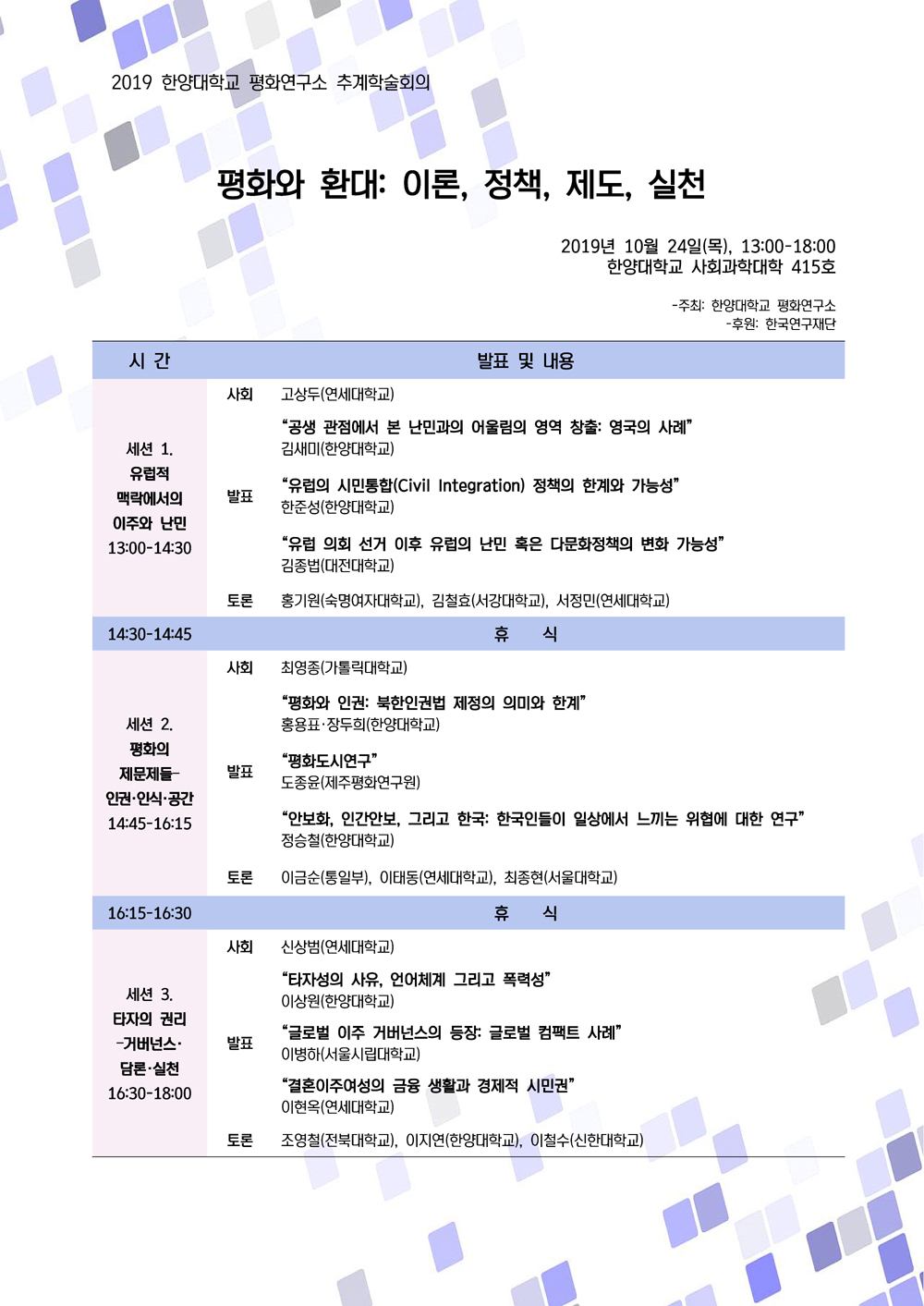 세션2는 ‘평화의 제문제들 - 인권·인식·공간’을 주제로 ▲홍용표·장두희 한양대 교수가 ‘평화와 인권: 북한인권법 제정의 의미와 한계’, ▲도종윤 제주평화연구원이 ‘평화도시연구’, ▲정승철 한양대 교수가 ‘안보화, 인간안보, 그리고 한국: 한국인들이 일상에서 느끼는 위협에 대한 연구’에 대해 발표를 한다.