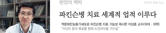 1996년 애틀란타 올림픽 개회식 , 전 세계인들의 관심 속에 마지막 성화 점화자로 낙점된 한 남성이 양손을 떨며 성화 점화를 했다. 그는 바로 1960년 로마 올림픽 복싱 챔피언이자, ‘나비처럼 날아서 벌처럼 쏜다’라는 명언을 남긴 복싱계의 살아있는 전설 무하마드 알리. 링 위의 수많은 복서들을 제압하고 챔피언 의 자리에 올랐던 그를 떨게 한 것은 무엇인가. 다름 아닌 ‘파킨슨병’이다. 파킨슨병은 치매, 중풍과 함께 3대 노인성 질환으로 꼽힌다. 아직 병의 진행을 멈추게 하는 뚜렷한 방법이 없어 많은 연구자들이 파킨슨병 치료에 매달리고 있다. 이 와중에 얼마 전 우리대학 이상훈 교수(의 대·의학)가 환자맞춤형 파킨슨병 치료의 가능성을 보여주는 연구에 성공했다는 기쁜 소식을 전 해줬다. 오랜 연구 끝에 값진 결과물을 얻은 이 교수를 인터넷한양이 만나봤다.