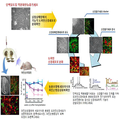 “이런 문제점 때문에 저희 실험실에서는 줄기세포를 분리. 배양을 통해 다량의 줄기세포를 확보하고 도파민신경세포로 효율적으로 분화케 하여 여러 파킨슨환자에게 이식할 수 있을 만큼 많은 도파민신경세포를 획득하는 연구를 해왔습니다. 그리고 배양된 줄기세포를 파킨슨병 모델 동물에 이식하여 그 치료효과도 보았지만, 줄기세포 이식치료에서 궁극적으로 부딪히는 문제는 동물이나 다른 사람의 세포보다는 환자 자신에게서 유래된 세포를 사용해야 한다는 것이었습니다, 이와 같이 환자 자신에게서 유래된 줄기세포로 세포 이식하는 치료를 환자 맞춤형 세포 치료라고 하지요. 아마 황우석 박사님 사건을 통해 환자맞춤형 줄기세포에 대해서는 많이 친숙하실 거라 생각합니다. 결국 황우석 박사님의 환자맞춤형 줄기세포는 가짜로 판명되었고 2007년에 일본그룹에 의해 조직세포에 4개의 역분화 유도 인자를 바이러스를 이용해 도입하여 만든 역분화유도만능줄기세포(iPS cells)가 탄생되게 되었습니다. 즉 파킨슨 환자의 피부 등 조직 세포로 역분화만능줄기세포를 만들고 이를 도파민신경세포로 분화시켜 환자 뇌에 이식하는 것이 환자맞춤형 세포이식 치료에요. 저희가 이번 연구를 통해 이와 같은 역분화만능줄기세포를 이용하는 환자맞춤형 세포 이식치료가 가능하다는 것을 파킨슨병 동물 모델을 이용해 실험적으로 증명해 보여준 거지요.”