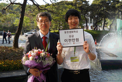 이 교수는 연구 성공이라는 희소식에 이어 상금 기부라는 훈훈한 이야기까지 전해줬다. 지난 5월 생화학분자생물학회에서 동 헌 생화학상을 수상한 이 교수는 받은 상금 1천만 원을 우리대학 의생명공학전문대학원에 기부했다.