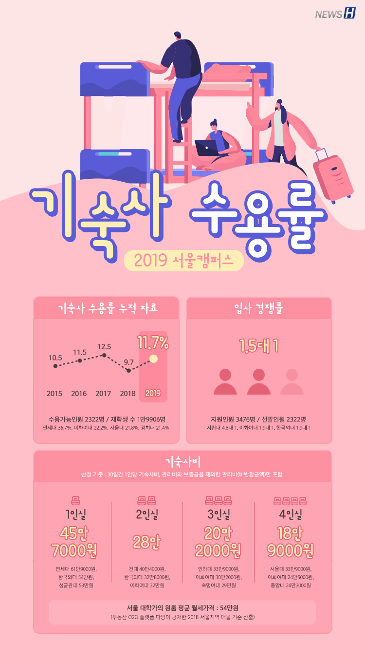 교육부가 지난 10월 대학정보 공시사이트 대학알리미에 전국 4년제 일반대학 기숙사 수용 현황을 공개했다. (관련 기사 보기 - [2020대입잣대] 기숙사 수용률 'RC체제' 연대 1위.. 이대 서울대 톱3) 2019년 한양대학교 서울캠퍼스 기숙사 수용률은 전년보다 2%포인트 상승한 11.7%로, 재학생 1만9906명 중 2322명의 학생을 수용할 수 있다.
