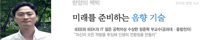 ‘IT 젊은 공학자상’ 이 상은 대한전자 공학회(IEEK)와 전기전자 분야에서 세계적 권위를 가진 미국전기전자학회(IEEE)가 공동으로 주관한다. 이는 IT 분야에서 연구업적이 뛰어난 40세 미만의 젊은 연구자 한 명에게만 수여해 커다란 명예를 지닌 상으로 평가받는다. 올해로 6회째를 맞은 이 상의 주인공이 바로 우리대학 서울캠퍼스의 장준혁 부교수(공과대ㆍ융합전자)다. 음성통신 및 신호처리 분야 전문가인 장 교수는 음향 기술의 우수한 연구업적을 인정받아 올해 수상자의 영예를 안게 됐다. 인터넷한양 뉴스팀에서 그를 만나봤다.