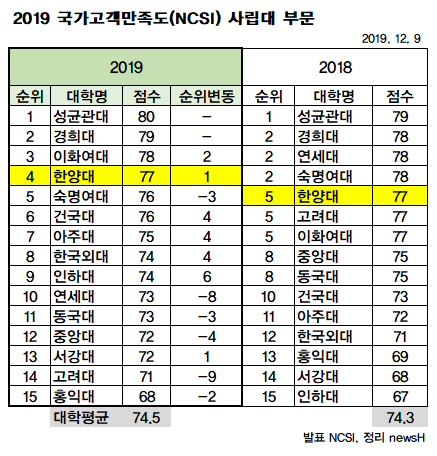 한양대는 만족도조사 2018년 발표에서 77점으로 5위를 차지했으나 올해는 4위로 한계단 올라섰다. 점수는 동일했다. 전체 대학 평균이 전년도와 유사한 74.5를 기록하였으며 한양대는 평균보다 2.5점이 높았다. 2017년 8위에서 2018년 5위, 2019년 4위로 계속해서 순위 상승을 이어오고 있다.