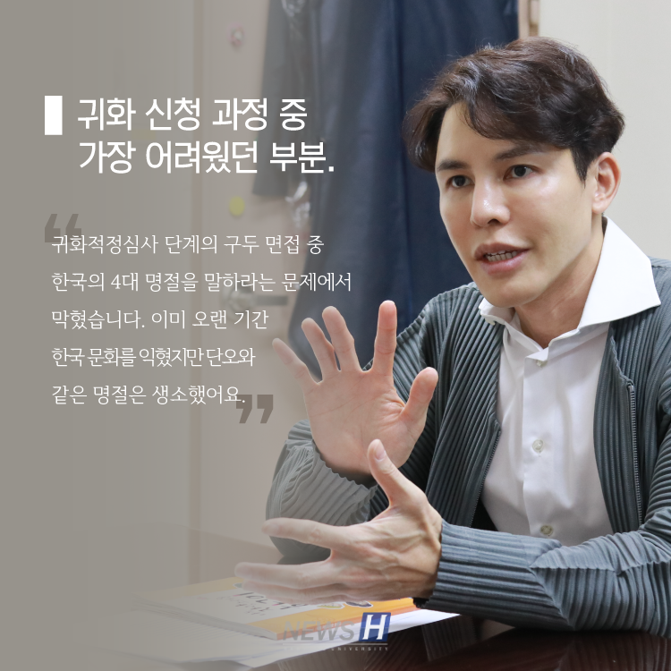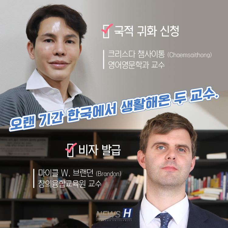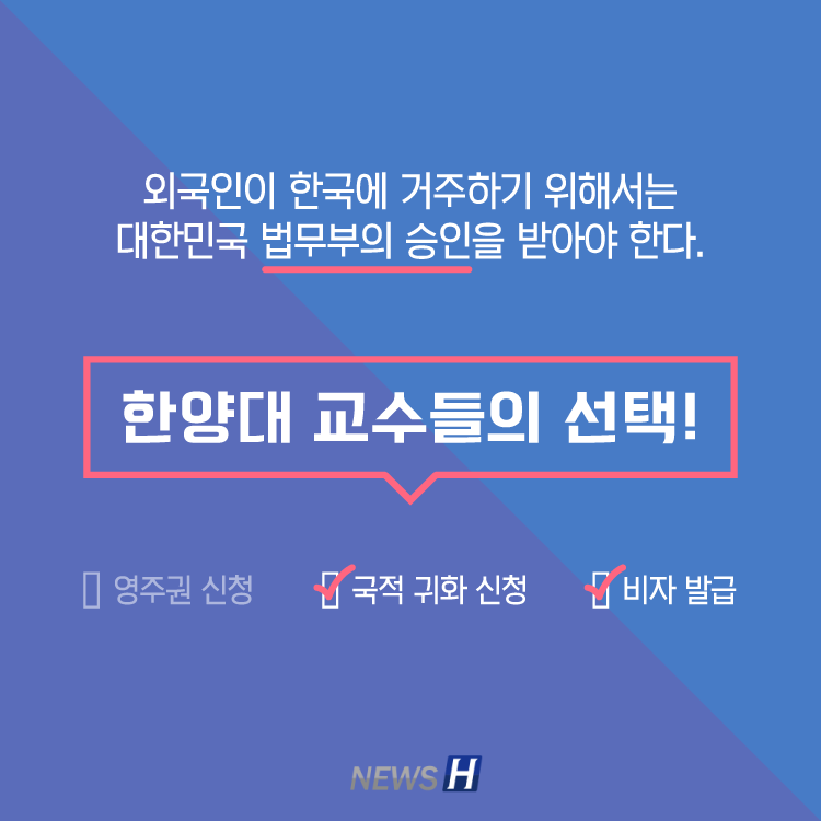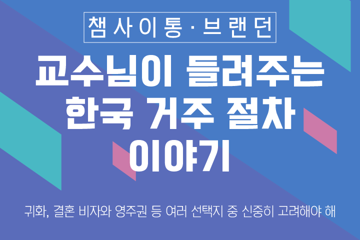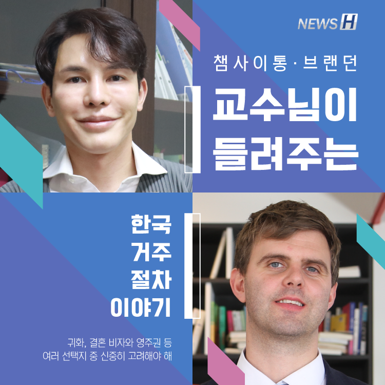귀화, 결혼 비자와 영주권 등 여러 선택지 중 신중히 고려해야 해 ▲ 카드뉴스의 원본 기사는 아래에서 읽을 수 있습니다 챔사이통·브랜던 교수님이 들려주는 한국 거주 절차 이야기 키워드 '한양위키' 키워드 보기 #챔사이통크리스다 #마이클 W . 브랜던 전채령 dotteil@naver.com 다른기사 보기 저작권자 © 뉴스H 무단전재 및 재배포 금지 당신만 안 본 뉴스 [포토스토리] "AI 시대 해답은 브랜딩", 오세훈 서울시장의 경영학 특강 현장 Into the Creation 2025, 창작자들의 꿈에 날개를 이찬규 학생, 사이버·우주 융합연구로 2025 사이버안보논문공모전 대상 수상 한양대, '2026 QS 지속가능성 순위' 세계 161위, 국내 4위 기록 해커톤에서 인턴십까지, 현대차 사내 스타트업에 다녀오다 [창업지원단 인턴십 경험기] [포토스토리] 한양 속에 사회혁신을 품다, SSIR 먼슬리 콜로키움 현장 행복은 좋은 경험의 ‘빈도’에서, 서은국 교수와 함께한 한양인의 힐링콘서트 현장 [포토스토리] "AI 시대 해답은 브랜딩", 오세훈 서울시장의 경영학 특강 현장 댓글삭제 삭제한 댓글은 다시 복구할 수 없습니다. 그래도 삭제하시겠습니까? 비밀번호 닫기 기사 댓글 0 댓글 접기 로그인 후 이용 가능합니다. 댓글 내용입력 비회원 로그인 이름 비밀번호 댓글 내용입력 댓글쓰기 계정을 선택하시면 로그인·계정인증을 통해 댓글을 남기실 수 있습니다. 회원 로그인 비회원 글쓰기 이름 비밀번호 자동등록방지 로그인 옵션 창닫기 기획기사 [포토스토리] "AI 시대 해답은 브랜딩", 오세훈 서울시장의 경영학 특강 현장 Into the Creation 2025, 창작자들의 꿈에 날개를 해커톤에서 인턴십까지, 현대차 사내 스타트업에 다녀오다 [창업지원단 인턴십 경험기] [포토스토리] 한양 속에 사회혁신을 품다, SSIR 먼슬리 콜로키움 현장 행복은 좋은 경험의 ‘빈도’에서, 서은국 교수와 함께한 한양인의 힐링콘서트 현장 [카드뉴스] '한양대학교 SDGs? 알고 보니 내 일상 속에 있었다!' 1편