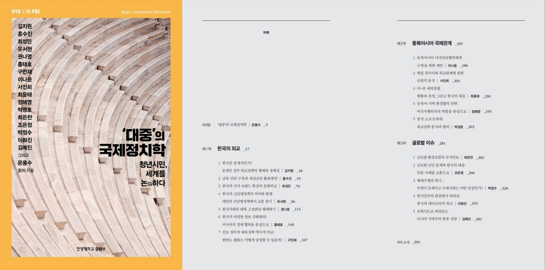 <‘대중’의 국제 정치학>은 지난 1학기 정치외교학과에 개설된 수업 ‘외교정책의 이해’에서 탄생했다. 총 17편의 국제 정치 논문이 책에 담겨있다. 지난 6개월간 IC-PBL 수업에서 함께 발표하고 토론하는 과정을 거쳐 완성된 연구 논문들이다. 학생들은 수업을 통해 국제 정치를 자신의 문제로 인식했고 지식의 생산자이자 서술의 주체가 됐다. 참신하고 다채로운 논문 주제들도 눈길을 끈다. 우리나라 현 대통령의 외교 정책이나 대북 정책부터 글로벌 환경오염과 난민 이슈까지 세계를 망라하는 글들이 책을 풍성케 했다.
