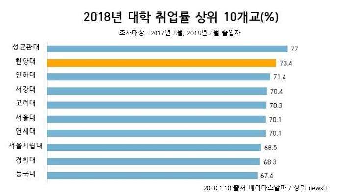 한양대는 졸업자 3206명 중 2007명이 취업하며 73.4%로 작년에 이어 올해도 성균관대 다음으로 높았다. 성균관대는 공학계열과 자연계열을 중심으로 77%의 높은 취업률을 보이며 3년 연속 가장 높은 취업률을 기록했다. 이어 인하대(74.1%), 서강대(70.4%), 고려대(70.3%), 서울대(70.1%)가 뒤를 이었다.