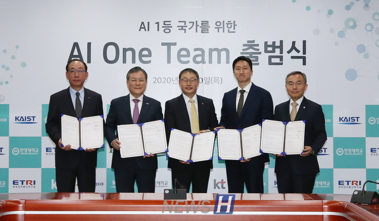 대전 KAIST 본관 회의실에서 열린 MOU 체결식에는 김우승 한양대 총장, 구현모 KT 대표이사 내정자, 정기선 현대중공업지주 부사장, 신성철 KAIST 총장, 김명준 ETRI 원장, 장석영 과학기술정보통신부 제2차관 등이 참석했다.