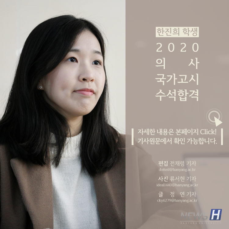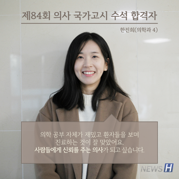 360점 만점에 339점, 제84회 의사 국가고시 수석 합격 ▲ 카드뉴스의 원본 기사는 아래에서 읽을 수 있습니다 - 한진희 학생, 2020 의사 국가고시 수석 합격으로 의사 첫 발 내딛다 키워드 '한양위키' 키워드 보기 #한진희 #의학과 전채령 dotteil@naver.com 다른기사 보기 저작권자 © 뉴스H 무단전재 및 재배포 금지 당신만 안 본 뉴스 [포토스토리] "AI 시대 해답은 브랜딩", 오세훈 서울시장의 경영학 특강 현장 Into the Creation 2025, 창작자들의 꿈에 날개를 이찬규 학생, 사이버·우주 융합연구로 2025 사이버안보논문공모전 대상 수상 한양대, '2026 QS 지속가능성 순위' 세계 161위, 국내 4위 기록 해커톤에서 인턴십까지, 현대차 사내 스타트업에 다녀오다 [창업지원단 인턴십 경험기] [포토스토리] 한양 속에 사회혁신을 품다, SSIR 먼슬리 콜로키움 현장 행복은 좋은 경험의 ‘빈도’에서, 서은국 교수와 함께한 한양인의 힐링콘서트 현장 [포토스토리] "AI 시대 해답은 브랜딩", 오세훈 서울시장의 경영학 특강 현장 댓글삭제 삭제한 댓글은 다시 복구할 수 없습니다. 그래도 삭제하시겠습니까? 비밀번호 닫기 기사 댓글 0 댓글 접기 로그인 후 이용 가능합니다. 댓글 내용입력 비회원 로그인 이름 비밀번호 댓글 내용입력 댓글쓰기 계정을 선택하시면 로그인·계정인증을 통해 댓글을 남기실 수 있습니다. 회원 로그인 비회원 글쓰기 이름 비밀번호 자동등록방지 로그인 옵션 창닫기 기획기사 [포토스토리] "AI 시대 해답은 브랜딩", 오세훈 서울시장의 경영학 특강 현장 Into the Creation 2025, 창작자들의 꿈에 날개를 해커톤에서 인턴십까지, 현대차 사내 스타트업에 다녀오다 [창업지원단 인턴십 경험기] [포토스토리] 한양 속에 사회혁신을 품다, SSIR 먼슬리 콜로키움 현장 행복은 좋은 경험의 ‘빈도’에서, 서은국 교수와 함께한 한양인의 힐링콘서트 현장 [카드뉴스] '한양대학교 SDGs? 알고 보니 내 일상 속에 있었다!' 1편